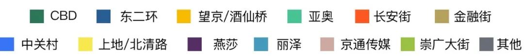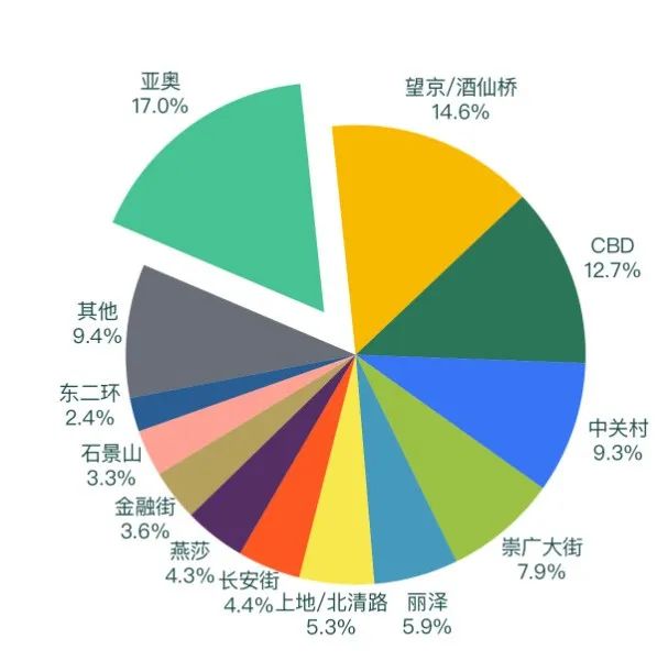 2023年第二季度,亞奧、望京 / 酒仙橋、 CBD 、中關(guān)村商圈是本季度成交的熱點(diǎn)區(qū)域,占比超過全市成交面積的 50% 。亞奧商圈在本季度成交面積占比為 17.0% ,望京 / 酒仙橋商圈成交面積占比為 14.6% , CBD 商圈成交面積占比為 12.7% ,中關(guān)村商圈成交面積占比為 9.3% 。