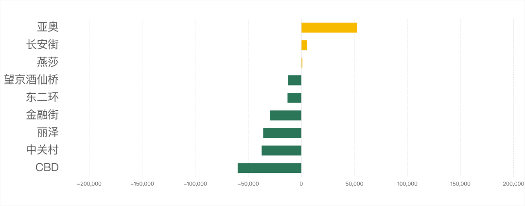 2023年第二季度,從各商圈成交面積來看,亞奧商圈本季度表現(xiàn)活躍,成交面積增長(zhǎng)超 5 萬平方米; CBD 商圈本季度成交面積下降明顯,約 6 萬平方米;除長(zhǎng)安街、燕莎商圈外,其他商圈成交面積環(huán)比上季度均呈現(xiàn)不同程度降低。